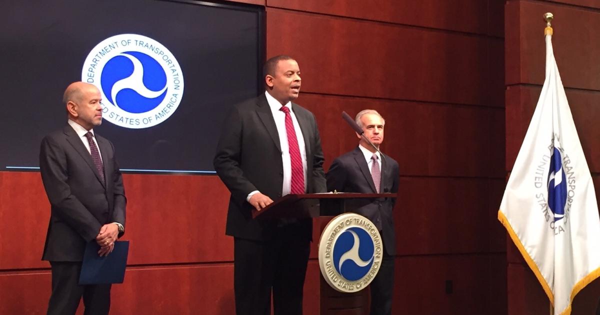 U.S. Transportation Secretary Anthony Foxx announces the release of the final SMS rule. To the left is FAA Administrator Michael Huerta; A4A president and CEO Nicholas Calio is at right. (Photo: FAA)